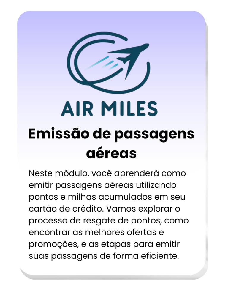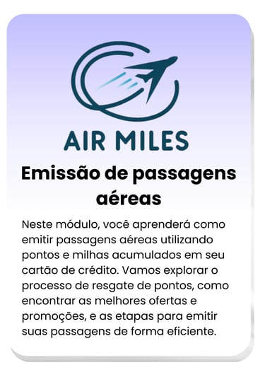 Neste módulo, você aprenderá como emitir passagens aéreas utilizando pontos e milhas acumulados em seu cartão de crédito. Vamos explorar o processo de resgate de pontos, como encontrar as melhores ofertas e promoções, e as etapas para emitir suas passagens de forma eficiente.
