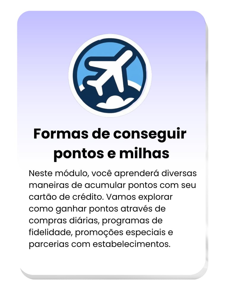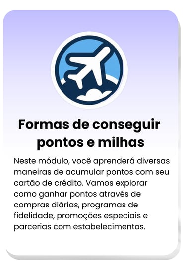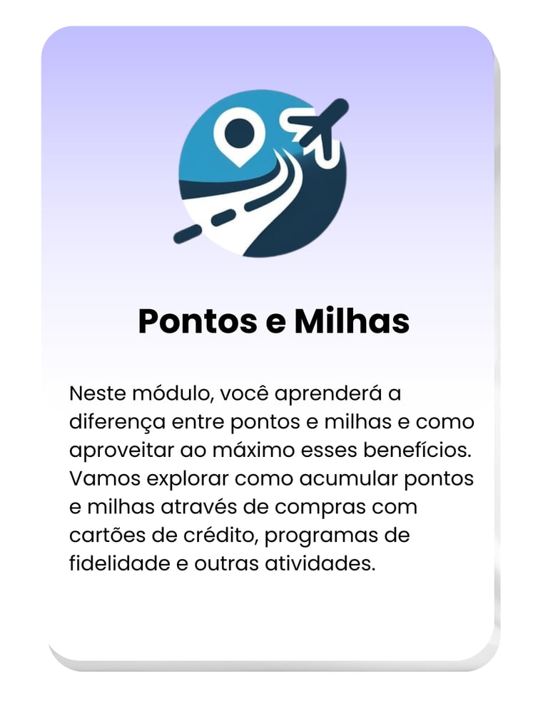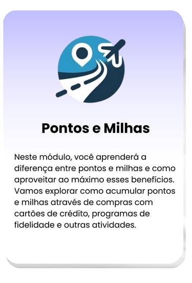 Neste módulo, você aprenderá a diferença entre pontos e milhas e como aproveitar ao máximo esses benefícios. Vamos explorar como acumular pontos e milhas através de compras com cartões de crédito, programas de fidelidade e outras atividades.