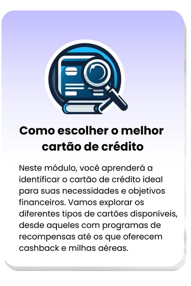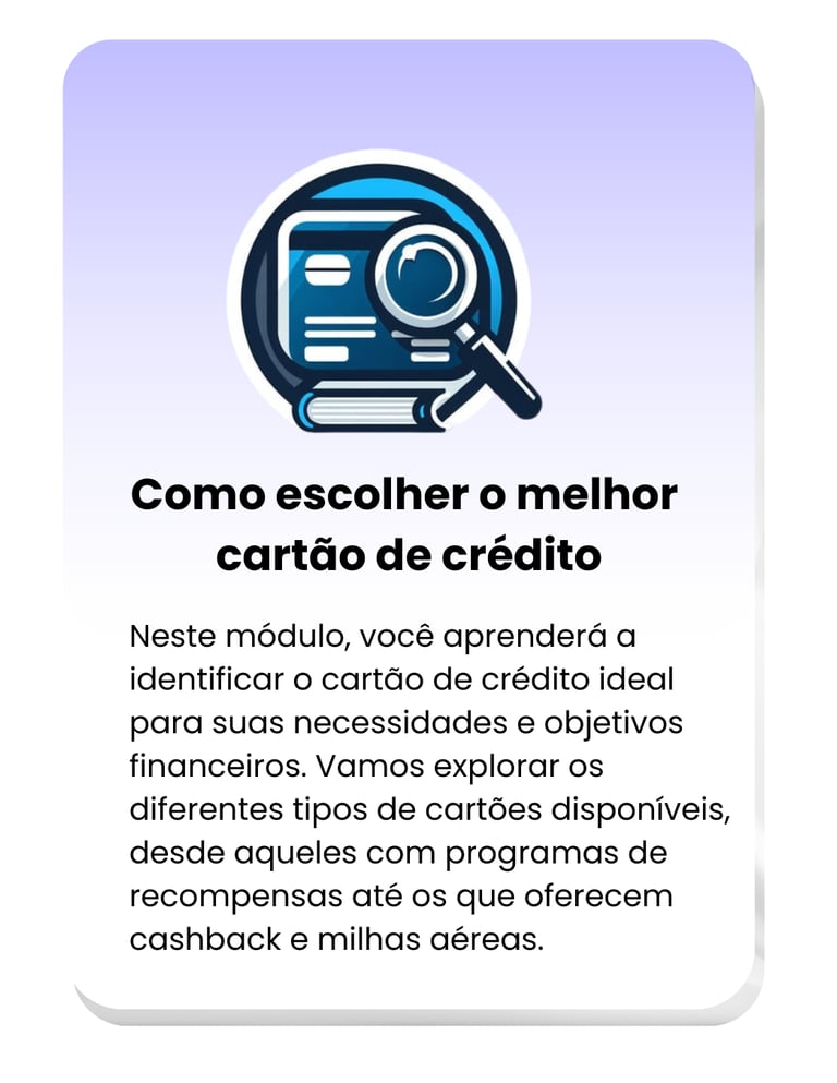 este módulo, você aprenderá a identificar o cartão de crédito ideal para suas necessidades e objetivos financeiros. Vamos explorar os diferentes tipos de cartões disponíveis, desde aqueles com programas de recompensas até os que oferecem cashback e milhas aéreas.