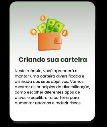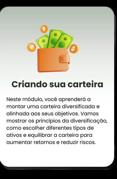 Neste módulo, você aprenderá como construir uma carteira de investimentos diversificada e alinhada com seus objetivos financeiros. Vamos explorar os princípios básicos da diversificação, como selecionar ativos de diferentes classes e como balancear sua carteira para maximizar retornos e minimizar riscos.