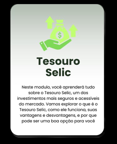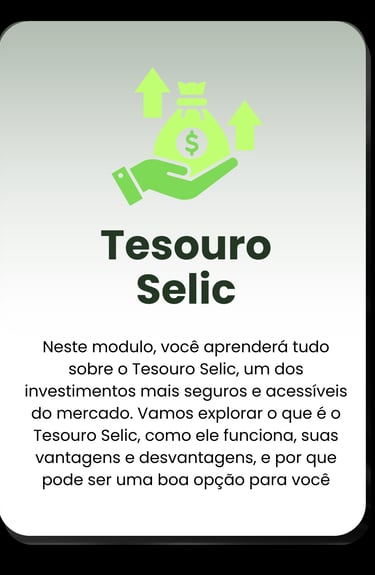 Neste modulo, você aprenderá tudo sobre o Tesouro Selic, um dos investimentos mais seguros e acessíveis do mercado. Vamos explorar o que é o Tesouro Selic, como ele funciona, suas vantagens e desvantagens, e por que pode ser uma boa opção para você.