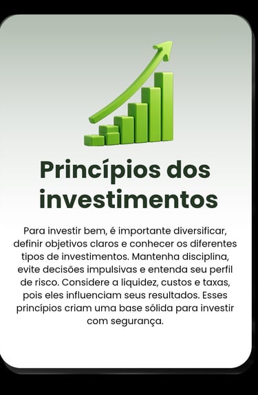 Para investir de forma eficaz, é importante diversificar seus ativos para reduzir riscos, definir objetivos financeiros claros, adquirir conhecimento sobre diferentes tipos de investimentos, manter disciplina e evitar decisões impulsivas. Também é essencial entender seu perfil de risco, considerar a liquidez dos investimentos e estar atento aos custos e taxas que podem impactar seus retornos. Esses princípios ajudam a construir uma base sólida para suas decisões de investimento.