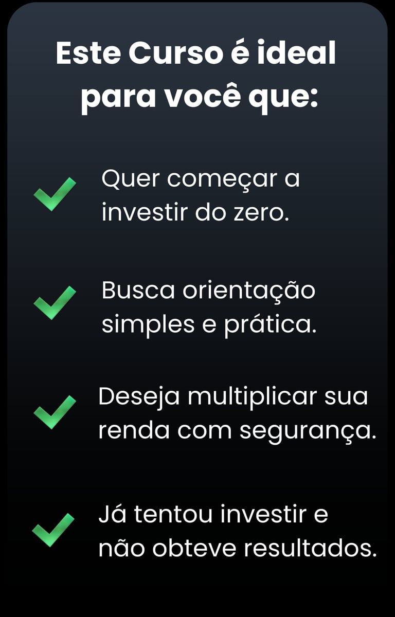 Nós vamos te ensinar a começar do absoluto zero até se tornar um investidor, entenda como multiplicar a sua renda e começar a prosperar.